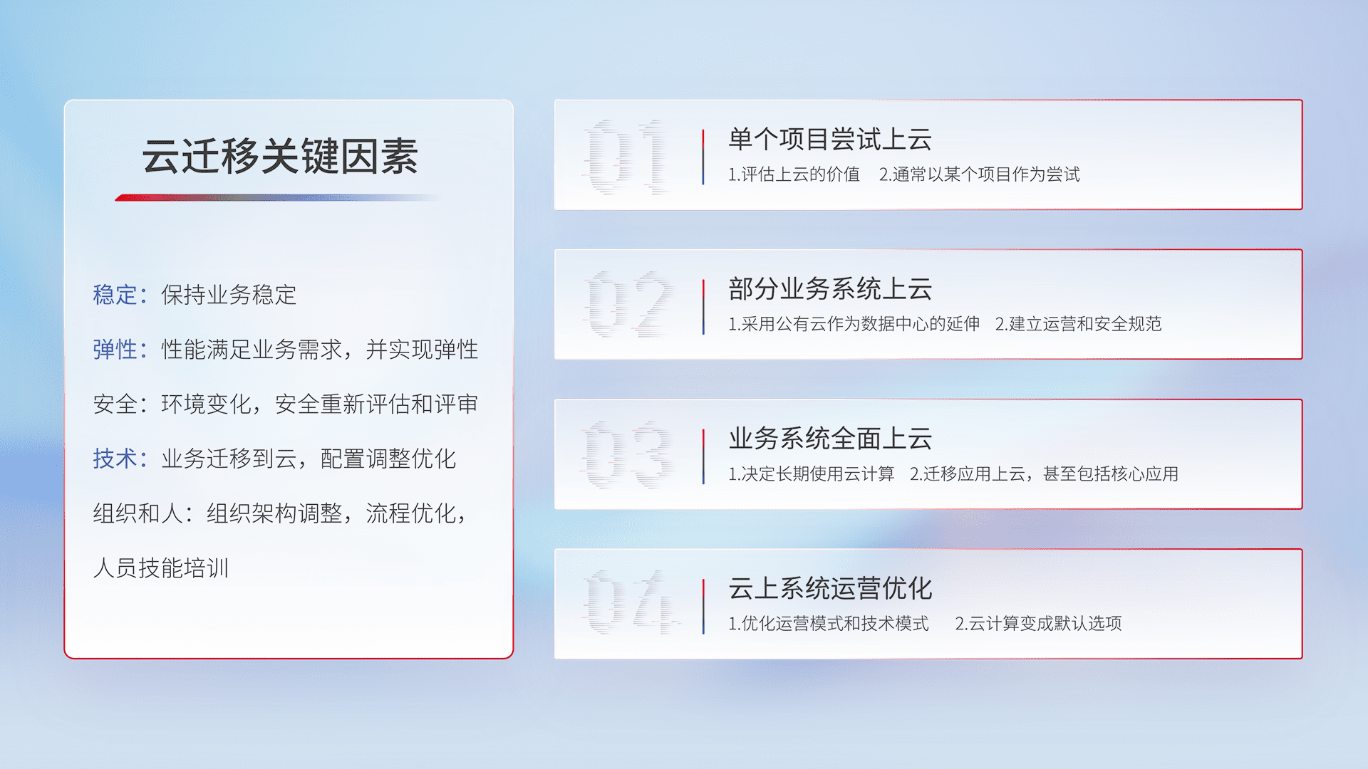 结合实际业务,,从规划设计、、云平台选型、、云原生改造、、、、数据迁移、、、集成交付,,迁移全过程为客户识别最佳上云路径,,,做好风险识别管理,,设计网络架构、、身份权限、、安全审计合规、、、操作审计、、、日志审计、、监控告警策略、、、多站点容灾设计等,,,对云上基础设施进行整体规划,,,提升IT治理水平,,,,以满足弹性、、高可用、、、高性能的需求。。。。