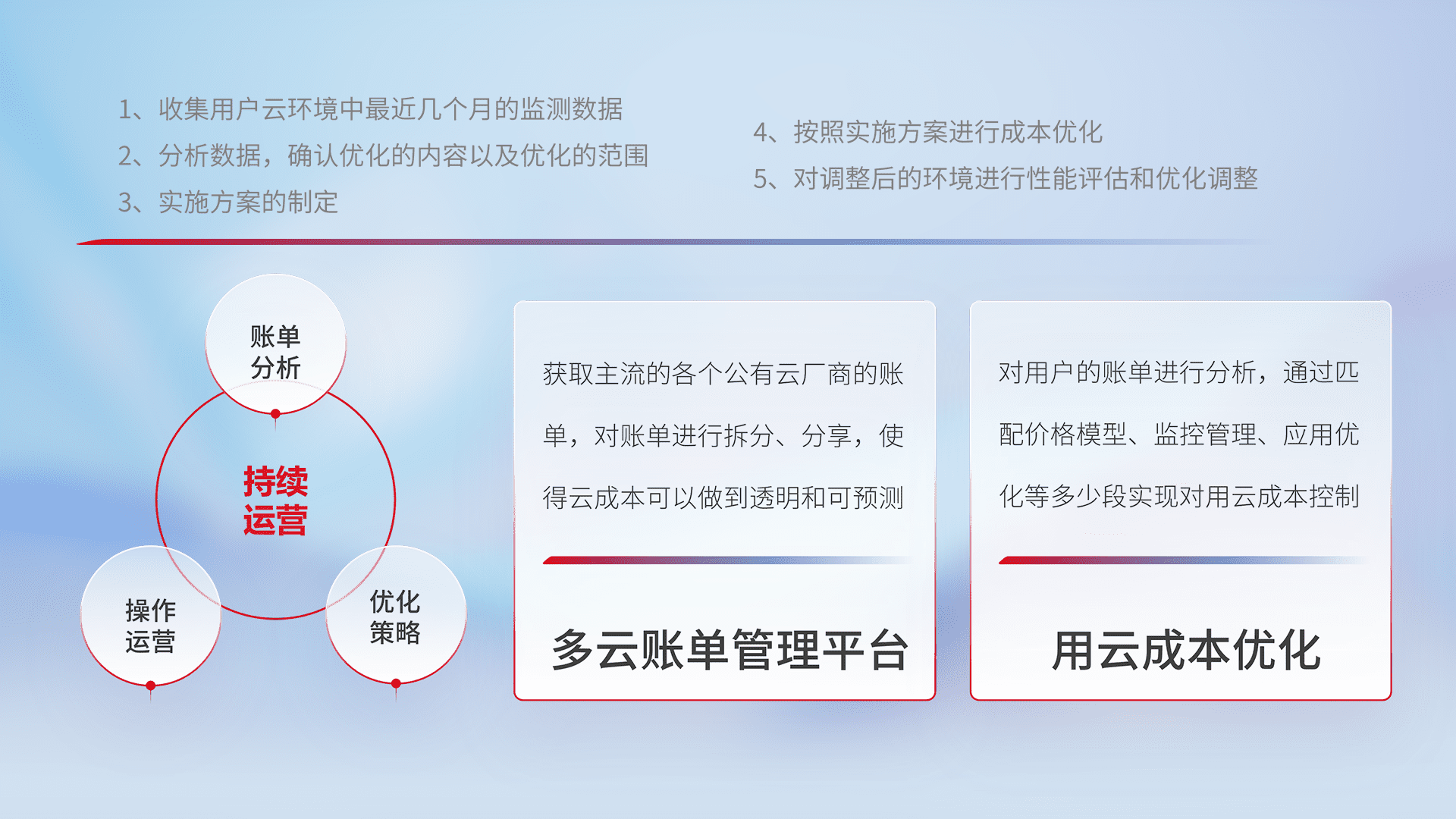 通过多云纳管,,以统一的资源数据模型把客户的云资源进行抽象和封装,,,进而实现对多云资源的统一操作,,,保障云资源管理的可靠性、、、、稳定性与可用性。。。。量身定制化运维内容,,,配置、、、开发运维、、补丁管理、、、备份、、监控、、认证和访问管理、、、、审计和日常巡检等,,,保障在用云过程中的可靠度,,,,稳定度以及高可用率。。。。